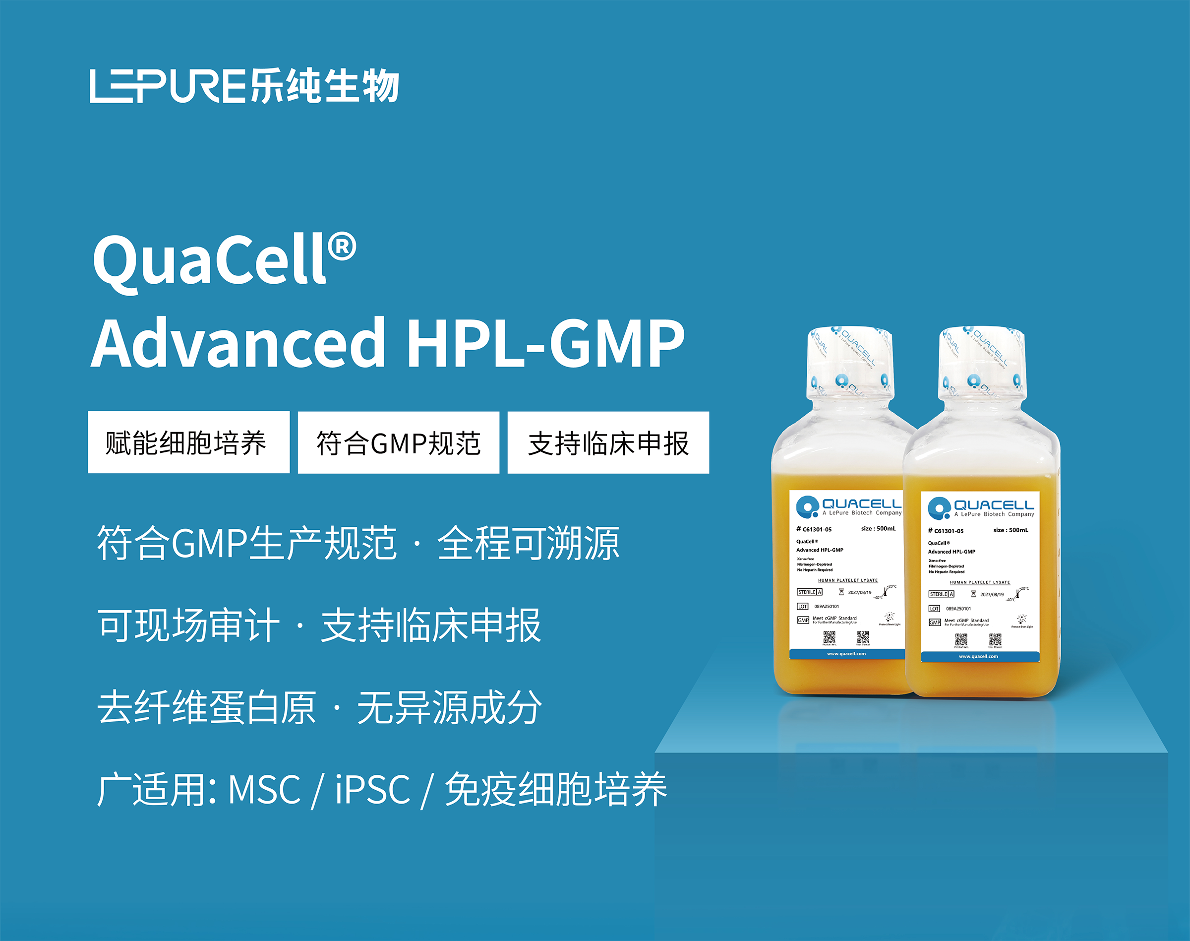 今天,乐纯生物旗下细胞培养专家QuaCell®带来破局者首款符合GMP生产规范的细胞培养添加物——人血小板裂解物Advanced HPL-GMP,专为临床级转化应用而生!