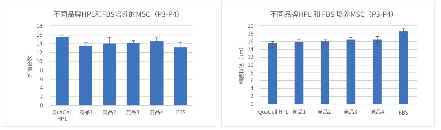 结果显示,使用 QuaCell® HPL-GMP 的实验组在 P3 代至 P4 代细胞扩增过程中表现优异,扩增倍数可达15倍,展现出良好的细胞增殖能力。
