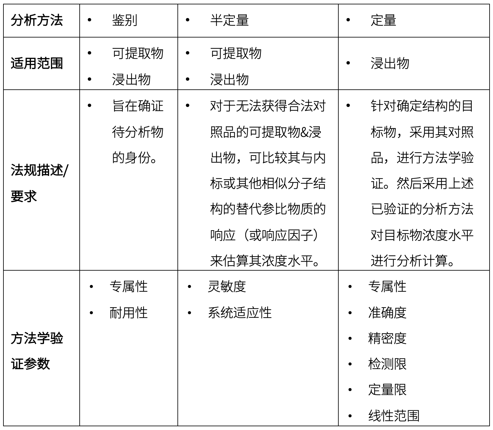 对于主要的分析仪器,需要对分析方法进行完整的方法学验证。参考CDE、ICH和USP等法规中关于分析方法验证的指导原则,可提取物&浸出物研究方法学验证要点如下表所示: