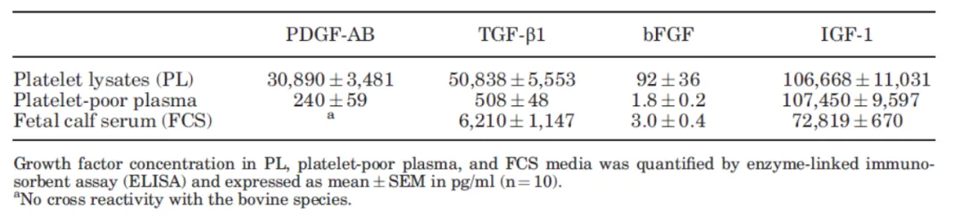 表1. HPL、Human Serum 与 FBS 中生长因子含量比较1