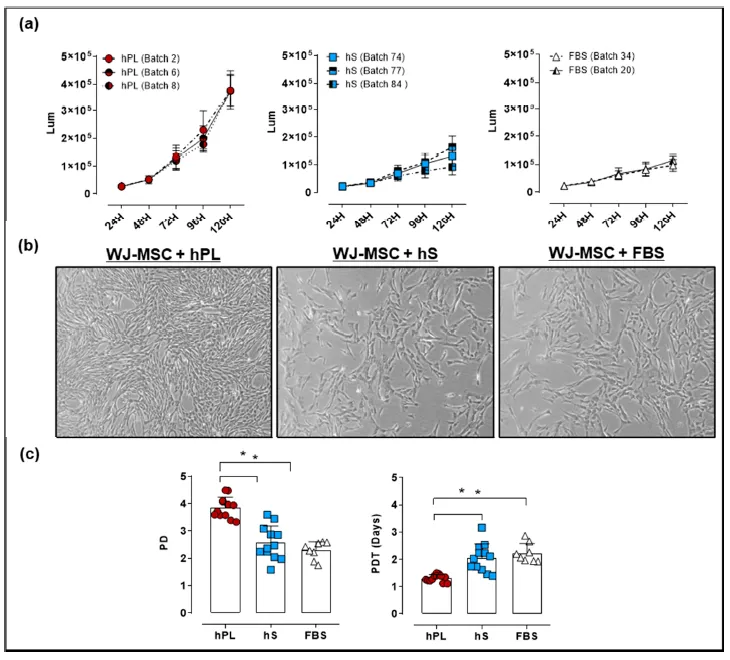 研究显示,HPL 显著提升了 MSC 的增殖效率。在细胞形态上,HPL 培养的 MSC 体积更小、形态更接近典型梭形;在增殖性能上,其倍增时间(PDT)更短、群体倍增数(PD)更高,均优于 FBS 和 HS 组2。这意味着在相同培养周期内可获得更多细胞,不仅缩短了扩增时间,也降低了培养成本,从而为更多患者获取生物治疗创造了条件。