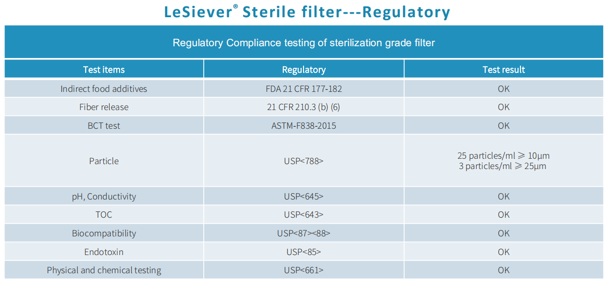 作为与药物中间品及终产品直接接触的过滤产品,乐纯生物除菌级过滤器完全符合FDA、USP等相关法规要求(见下图2)。