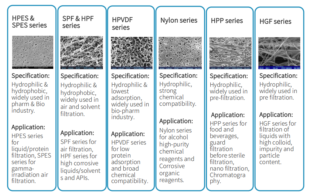 化药领域过滤器材质较多使用为PES,PVDF,PP,Nylon等,这些种类的滤器我们都有相关对应的产品,并且根据不同客户的兼容性或者吸附的要求,我们还有改性的滤器比如亲水的PTFE膜材可以作为选择。
