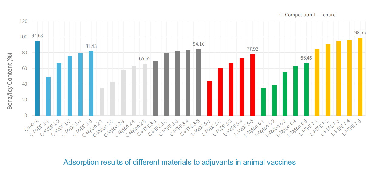 在生物制药方面,乐纯生物过滤纯化产品线同样拥有PES,PVDF以及PTFE等生物制药领域广泛应用的具备低吸附性能的过滤产品,以确保疫苗在生产过程中能够保持其有效成分的回收率和纯度。下图7为不同材质的滤器在动物疫苗的产品添加佐剂项目中吸附性的柱状比较图,可以看到在多种产品的测试中,相比其他PVDF和PES以及Nylon等材质的多组膜材的回收率数据,7-5组的PTFE吸附性表现最低,样品回收率最高。