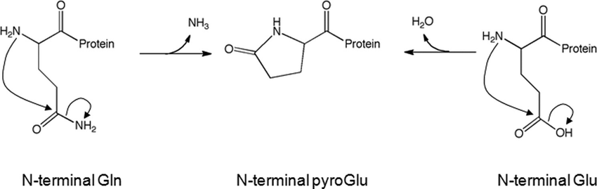 抗体分子轻链和重链的N末端往往是谷氨酸(Glutamate,Glu)或谷氨酰胺(Glutamine,Gln)。Glu和Gln在谷氨酰胺酰环化酶(Glutaminyl cyclase)的催化作用下可发生脱水或者脱氨反应,环化形成焦谷氨酸(pyro Glu)。