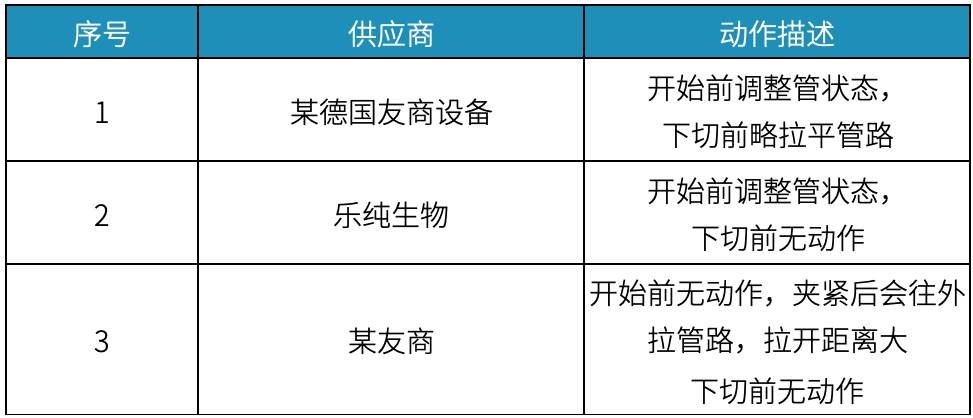 接管机完成杀菌与除热源流程后,刀片温度降至切管所需的热熔范围。此时,刀片下切(见图1),切断管路,并在切割过程中,管端沿刀片表面滑动。该过程确保管端始终贴合刀片,形成完整的热熔痕迹,如表3所示,展示了不同设备在切割状态下刀片表面的实际接触情况。