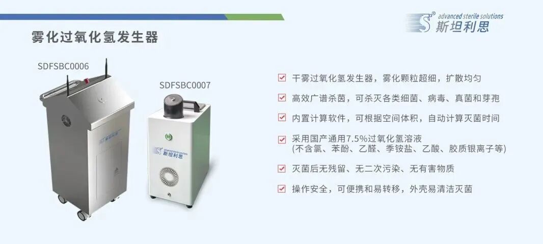 制药企业对于洁净室微生物控制的要求越来越高,不管是表面消毒,或是空间灭菌,都十分注重芽孢杀灭计划。过氧化氢灭菌成为制药企业空间灭菌的最佳选择,斯坦利思针对制药行业对于洁净室空间灭菌服务的需求,推出了空间干雾/汽化消毒灭菌设备以及与其配套使用的杀孢子剂,同时推出了过氧化氢空间灭菌服务。