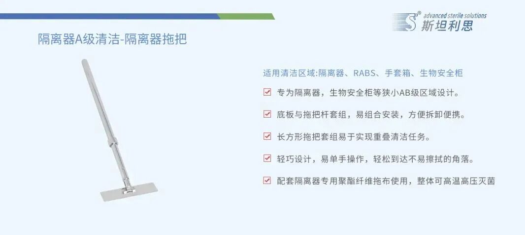 斯坦利思洁净室清洁用具齐全,产品包括:可灭菌拖把拖布、无尘擦拭布、预湿擦拭布,清洁小车等系列产品。