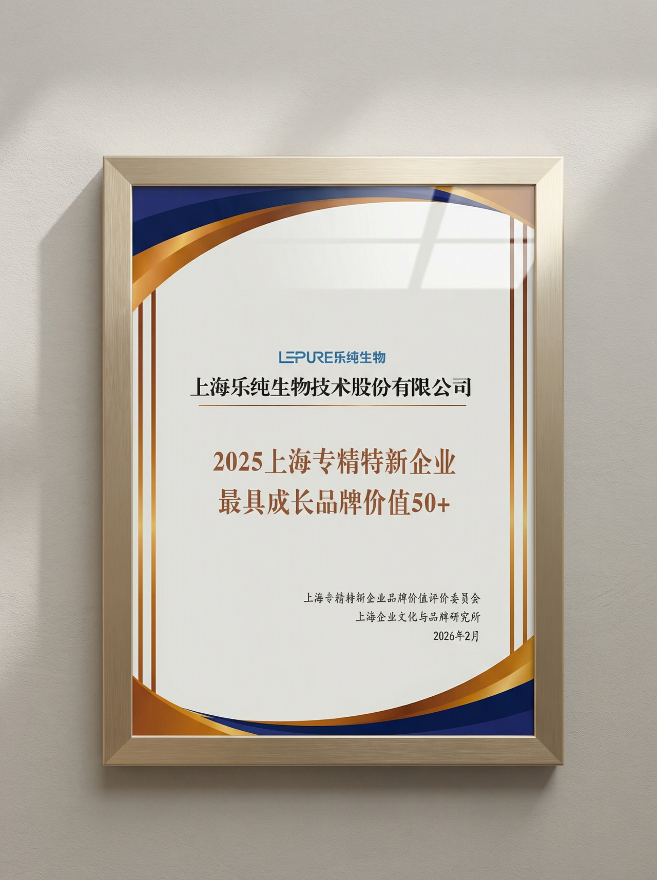 近日,乐纯生物入选“2025上海专精特新企业最具品牌价值50+”(最具成长品牌企业50强)