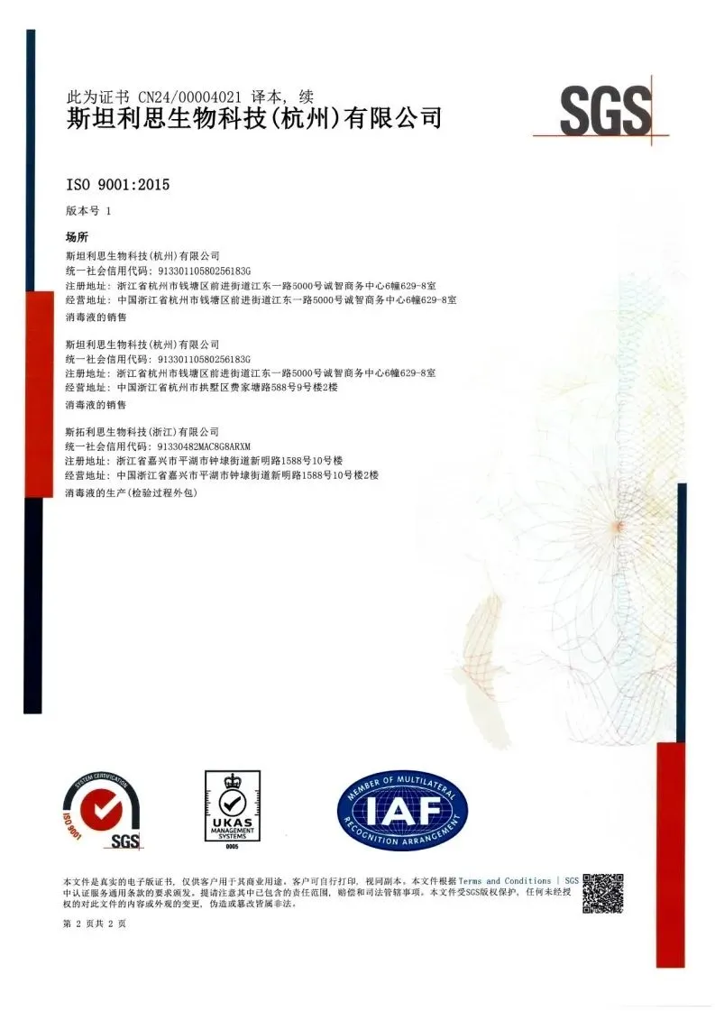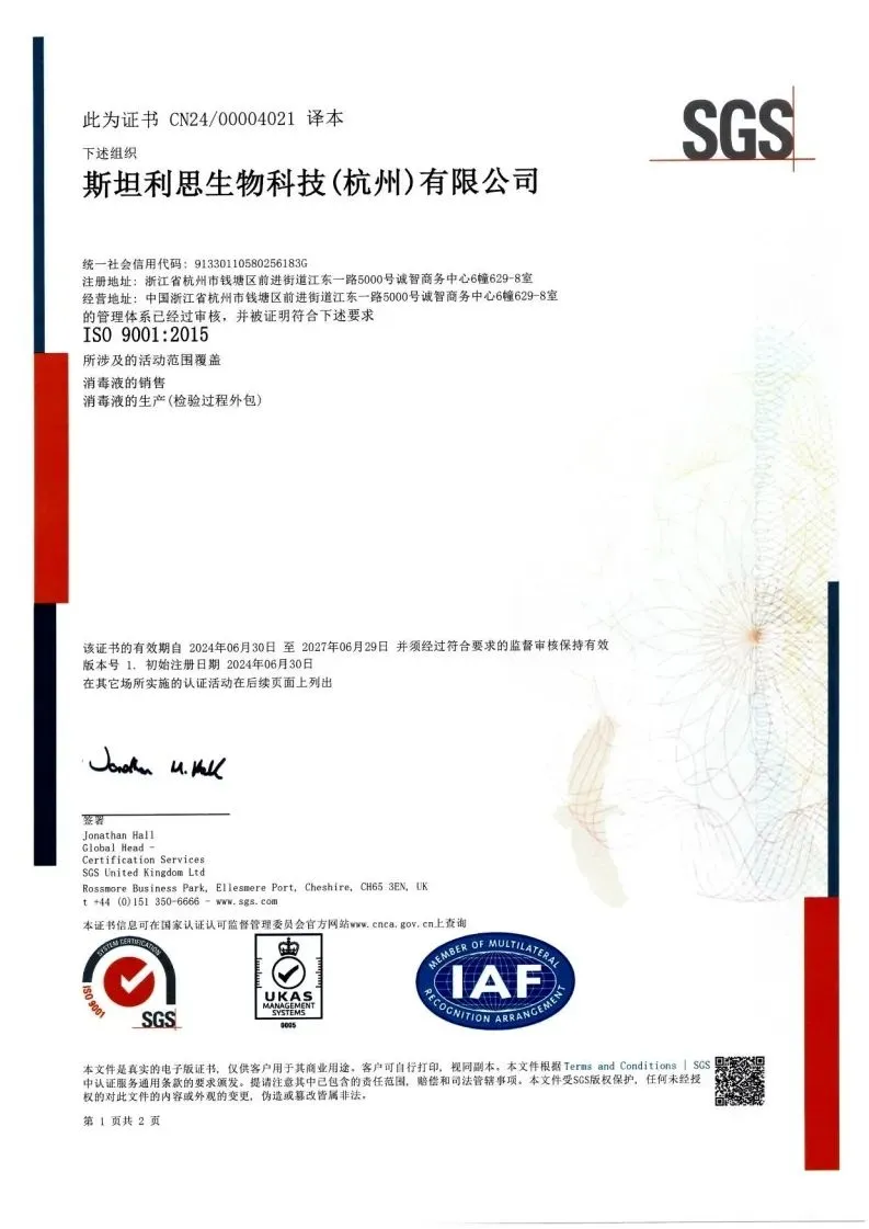 近日,乐纯生物集团旗下子公司斯坦利思生物科技(杭州)有限公司(以下简称:“斯坦利思”)顺利通过由SGS公司审核的ISO9001:2015质量管理体系认证。