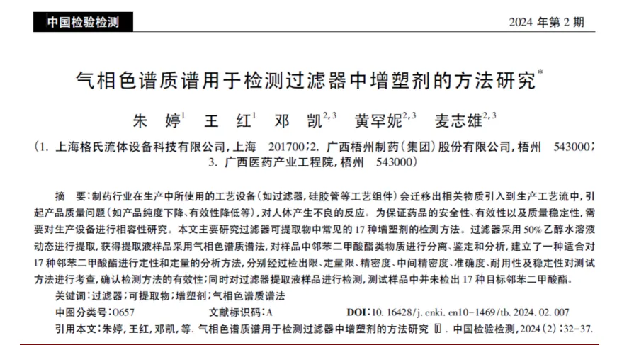 近期,乐纯生物集团旗下上海格氏流体设备科技(以下简称:“格氏流体”)有限公司与广西梧州制药(集团)股份有限公司(以下简称:“广西梧州制药”)在《中国检验检测》上联合发表了一篇关于过滤器可提取物检测方法的论文,该论文一经发布便受到了行业内广泛的关注以及高度的评价。