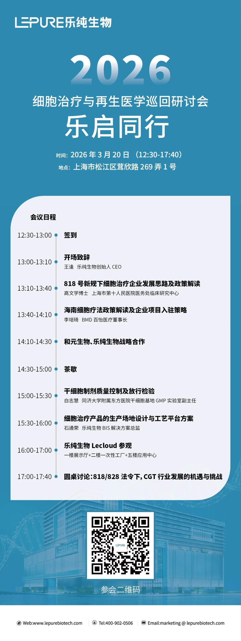 2026年3月20日,「乐启同行·细胞治疗与再生医学巡回研讨会—上海站」将在乐纯生物 云智造基地 举办。本次研讨会将汇聚来自科研与产业一线的专家学者,围绕CGT领域的前沿技术、应用实践与未来趋势展开交流,共同探讨细胞治疗与再生医学的创新路径。诚邀您莅临现场,与行业同仁携手同行,共启新程。