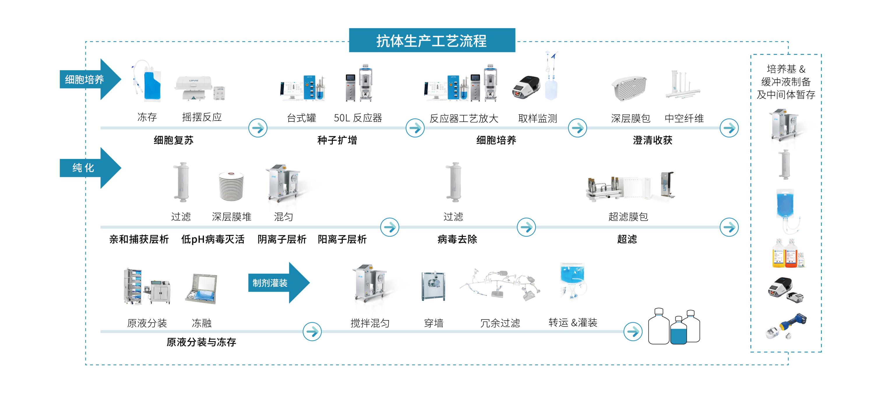 在抗体药物生产过程中,乐纯生物为中间体处理和缓冲液制备提供完整的一次性解决方案,确保过程高效、安全与合规: