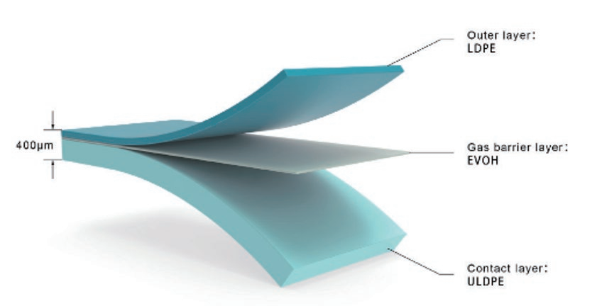 LeKrius®生物工艺薄膜由乐纯生物自主独立研发而成,主要材质为LDPE-EVOH-ULDPE,由多层共挤膜技术一 次性挤出生产。