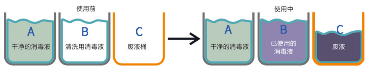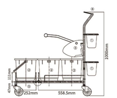 三桶清洁系统主体是不锈钢框架,组件包括三只30L的清洁桶,一个不锈钢拧干器,一个洁净拖布存放盒和一个已使用拖布暂存盒,不锈钢框架上设计有用来固定拖把杆的回型钩。全车可拆卸,组装简易,可耐受121°C高温高压湿热灭菌。