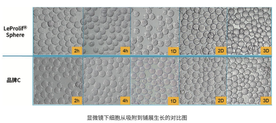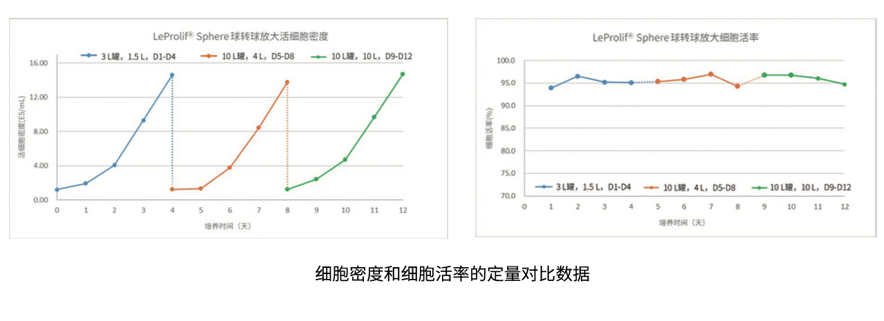 培养效果:LeProlif ®Sphere在搅拌玻璃罐中实现 了高密度增长>10倍;并且显示出优异的球转球性能