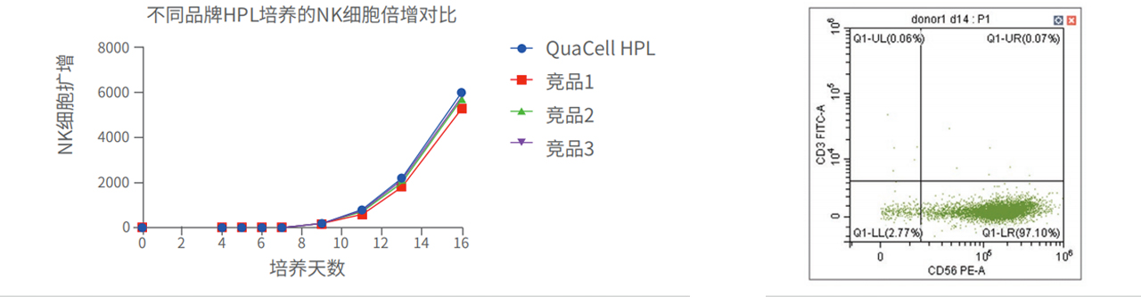 添加 QuaCell® HPL 的实验组,细胞倍增效率显著高于其他对照组,且 NK 细胞纯度可达 97% 以上。
